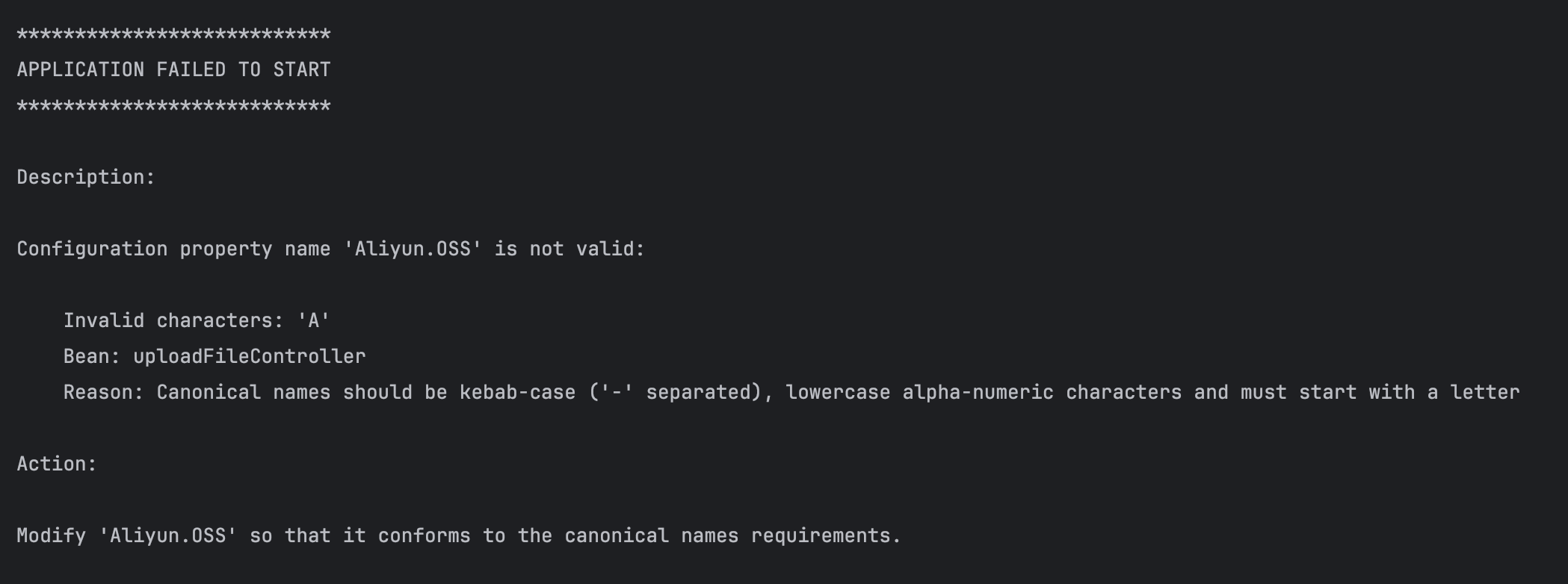 在配置阿里云OSS时,由于配置文件中的属性名Aliyun.OSS包含大写字母,导致应用程序启动失败。根据错误提示,配置属性名应遵循kebab-case格式,即使用小写字母和连字符分隔。因此,需要将Aliyun.OSS修改为aliyun.oss,以确保符合规范。具体修改包括将Aliyun:OSS:改为aliyun:oss:,并在@ConfigurationProperties注解中将prefix=&