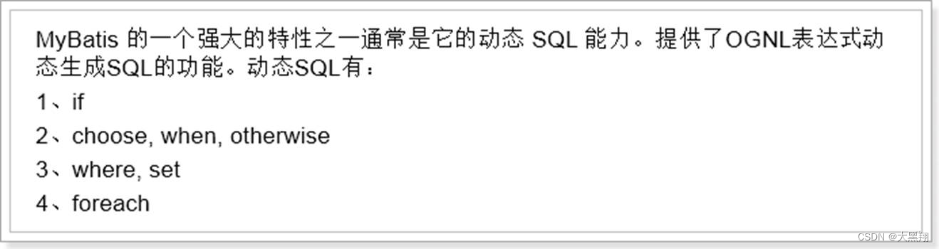 - MyBatis 的强大特性之一便是它的动态 SQL 能力。如果你有使用 JDBC 或其他类似框架的经验,你就能体会到根据不同条件拼接 SQL 字符串有多么痛苦