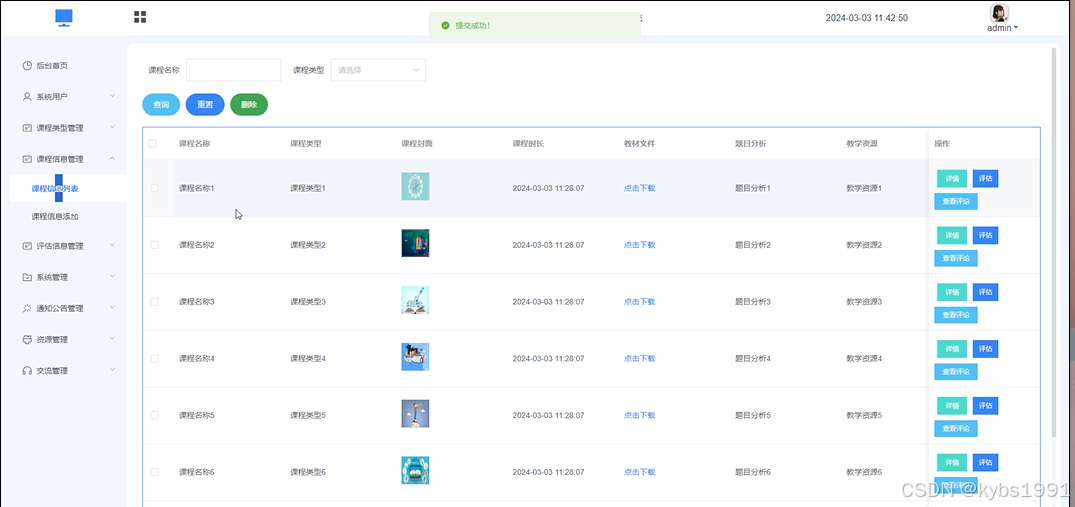 管理员点击后台左边的“课程信息管理”菜单后将可以对课程信息进行管理,包括添加、编辑和删除课程信息等,还可以查看和回复用户评论、查看评估信息等。课程信息管理界面如下图4-8所示。