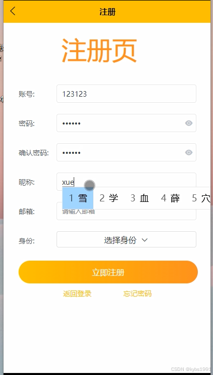 不是基于微信小程序的考研辅导系统的用户可以通过微信小程序在线进行注册,填写上自己的账号、密码、重复密码、昵称、邮箱登信息后点击“提交”按钮后将会验证是否有非空数据,再验证密码和重复密码是否一样,最后验证是否账号重复,都验证没问题后即可注册成功。注册实现了用户注册和发布者注册两部分,其用户注册界面展示如下图4-1所示。