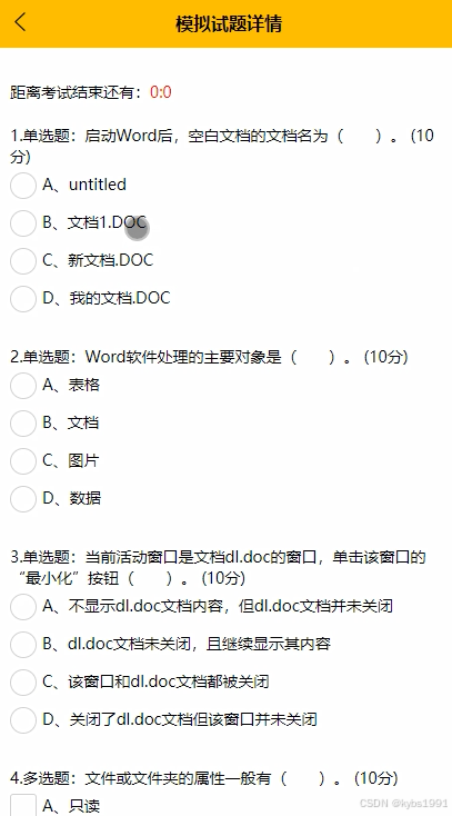 模拟试题: 提供学生用户进行模拟考试的功能,包括选择试卷、答题、查看成绩等。