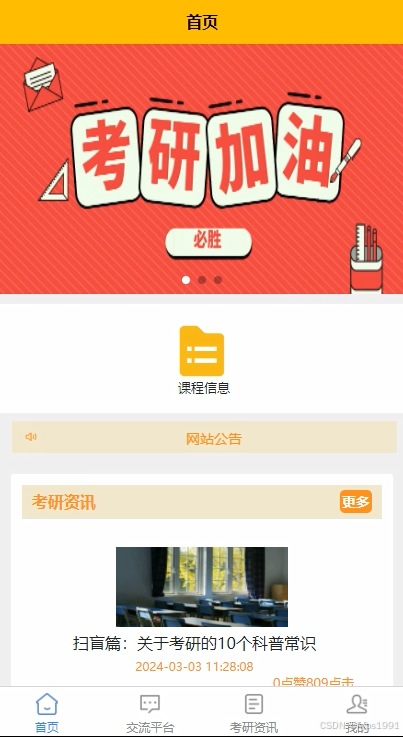 首页: 展示系统的主要功能入口和最新信息,包括模拟试题、课程信息、网站公告、交流平台和考研资讯等。