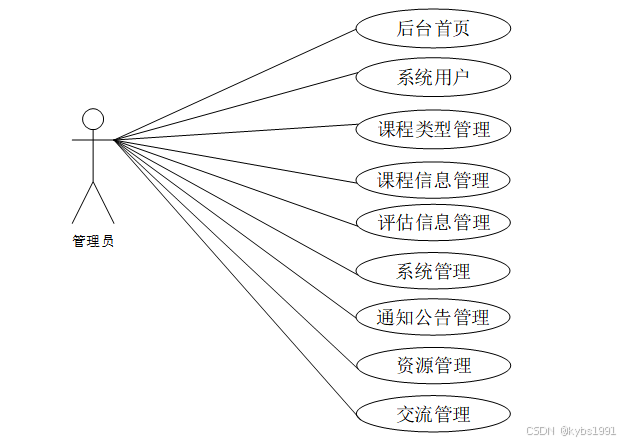 管理员角色的用例包括后台首页、系统用户、课程类型管理、课程信息管理、评估信息管理、系统管理(轮播图管理)、通知公告管理、资源管理(考研资讯、资讯分类、模拟试题)、交流论坛(交流论坛、论坛分类)。