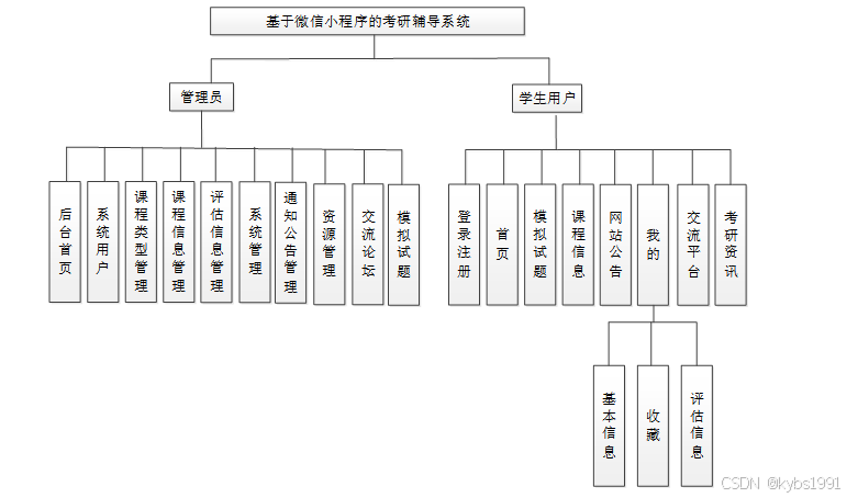 通过对基于微信小程序的考研辅导系统的功能需求分析以及用例分析,得出了基于微信小程序的考研辅导系统的功能模块图如图3-1所示。