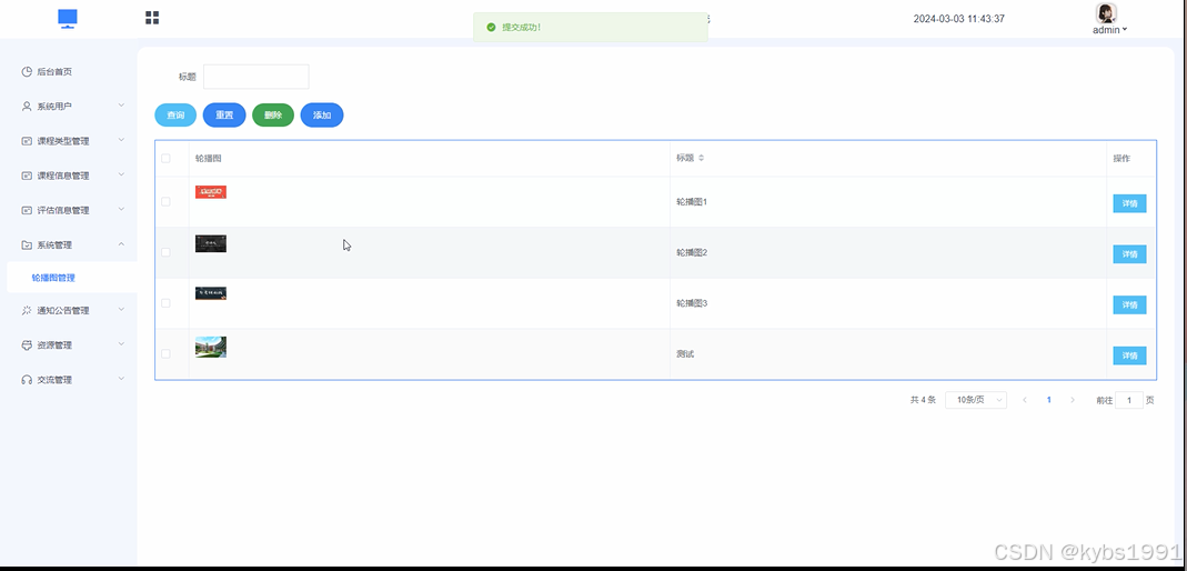 管理员点击“系统管理”这一菜单会显示轮播图这一个子菜单,管理员可以对前台展示的轮播图进行设置,界面如下图所示。