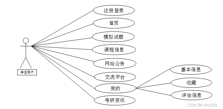学生用户角色的用例包括登录注册、首页、模拟试题、课程信息、网站公告、交流平台、考研资讯、我的(基本信息、收藏、评估信息)。