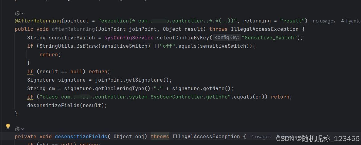 启动类加@EnableAspectJAutoProxy自定义注解,在实体类中使用表示被脱敏字段建立aop切面类可能这里gpt会建议你用@Pointcut("execution(public * com.xx.aop..*.get*(..))")这种方式拦截,这种我试了,拦截不住。猜测在mvc返回的时候,已经不被aop拦住了,除非手动调用。并且get方式还要user成为bean,不值当。直接拦截co
