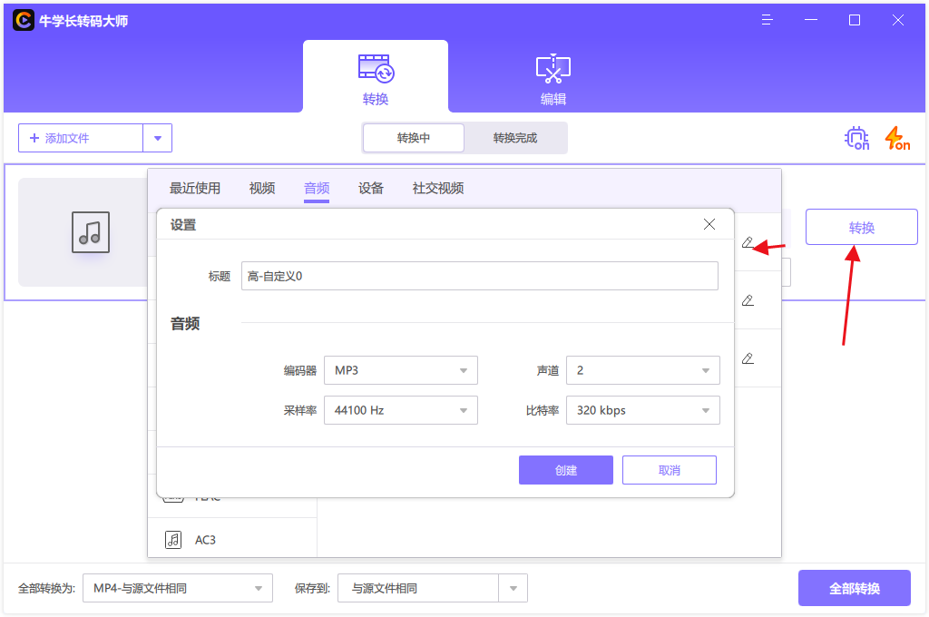 第二步:点击下面修改音频的输出格式为mp3格式,还可以选择通过单击编辑图标来自定义音频参数,例如比特率,采样率,编码器等。