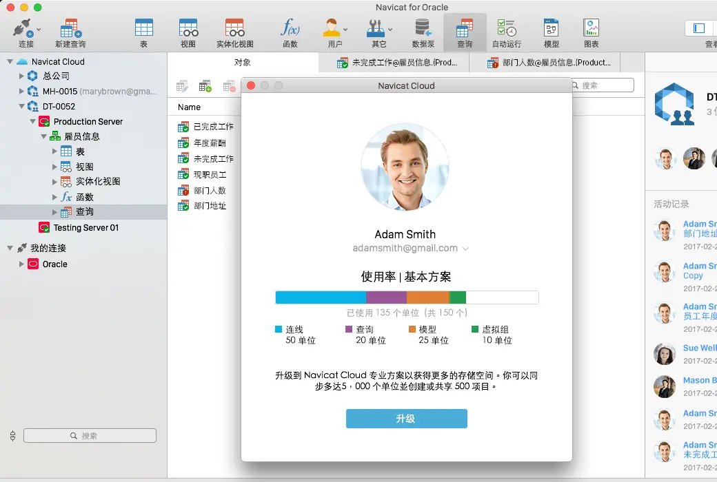 将你的连接设置、查询和虚拟组同步到我们的 Navicat Cloud 服务,以便你可实时访问它们,并随时随地与同事分享。有了 Navicat Cloud,你可善用每分每秒,使你的生产力达致最高。