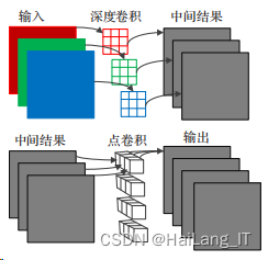 MobileNet作为高性能的轻量级网络,其参数量极大减少,主要依赖的就是深度可分离卷积。深度可分离卷积分为两步:深度卷积(Depthwise Convolution)与点卷积(Pointwise Convolution)。深度卷积即对输入每个通道进行平面卷积,获得与输入图像通道数相同的特征图像。其卷积步骤如图: