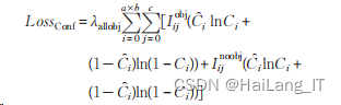 置信损失不仅需要考虑有目标时的置信损失,也需要考虑无检测目标的置信损失,因为这是确定目标位置的首要信息。 LossConf 的计算公式为: