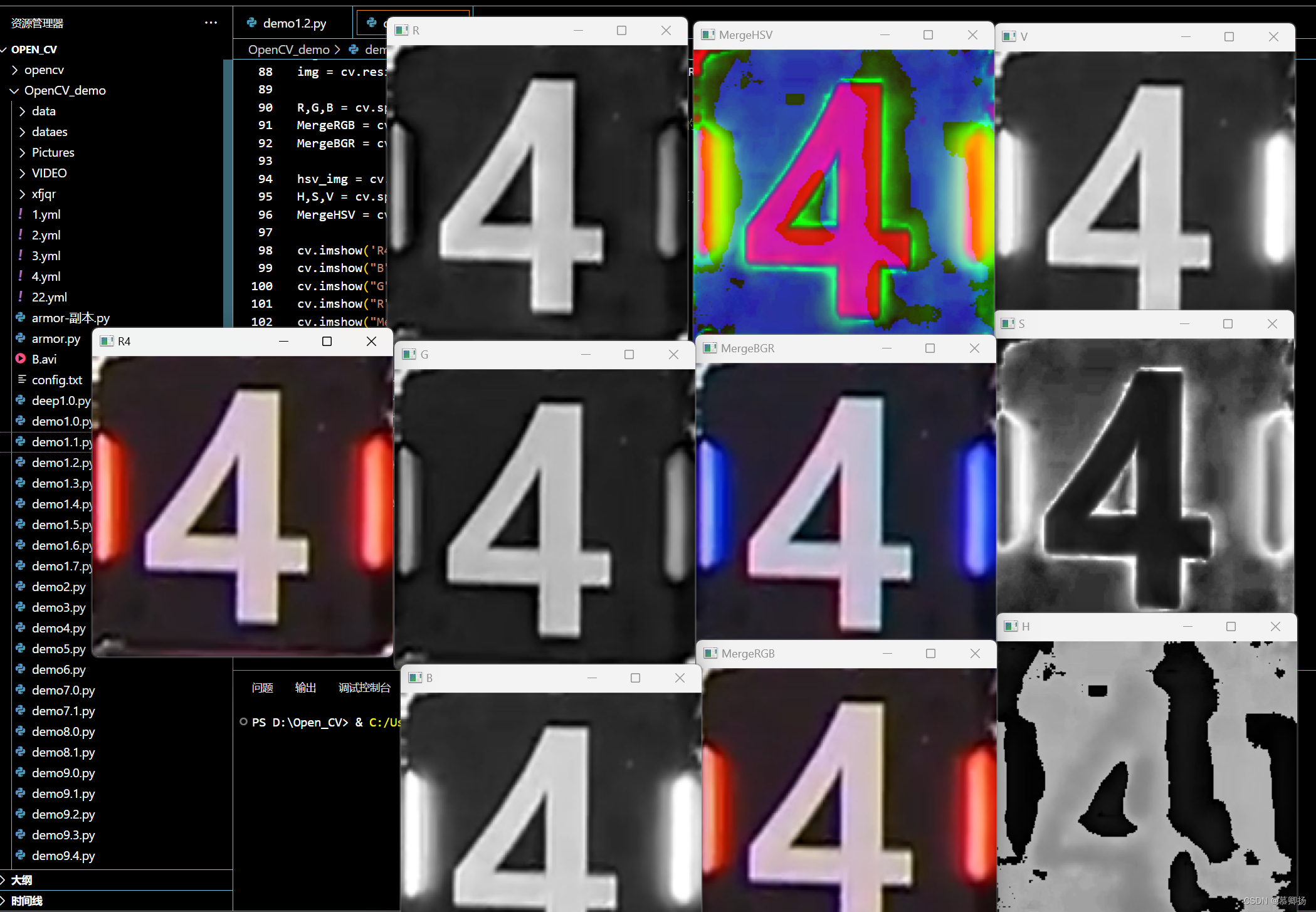 以下是一个使用OpenCVBGR转换为 HSV图像再进行分离图像通道的例子: