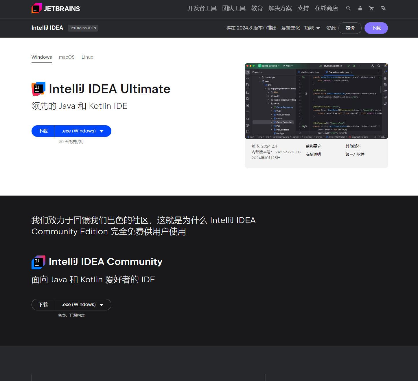 IDEA分商业版ultimate和社区版community;商业版是收费的,功能⽐较完善;社区版是免费的,功能稍弱。
