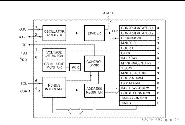 4、可编程时钟输出:32.768KHz/1024Hz/32Hz/1Hz