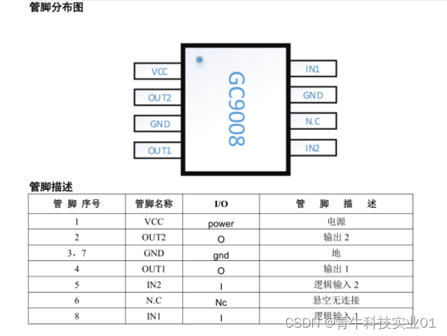 GC9008 是一款 12V 全桥驱动芯片,为提供高性价比的方案。它能提供 0.1A 的持续输出电流。可以工作在 4.5~15V 的电源电压上。 具有 PWM(IN1/IN2)输入接口,与行业标准器件兼容.是 SOP8封装,GC9008D是DIP封装