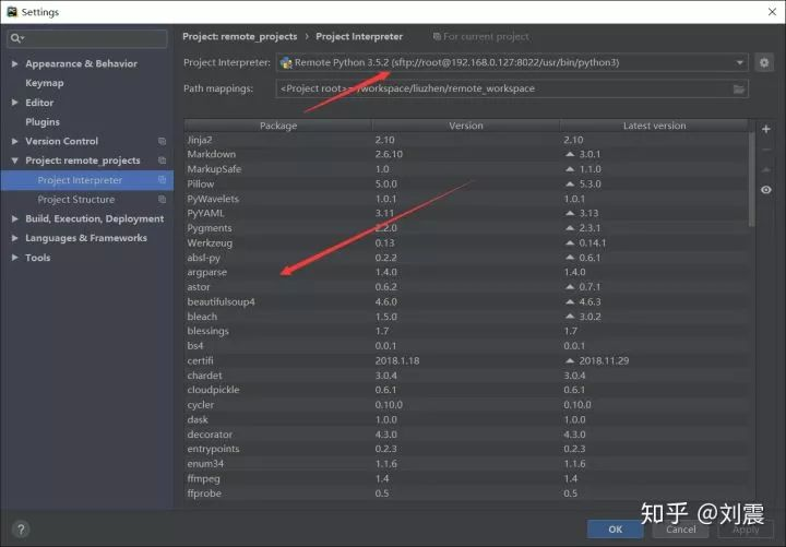 配置完成以后在项目解释器界面就会出现如下图所示,可以看到此时已经完成远程解释器的本地化: