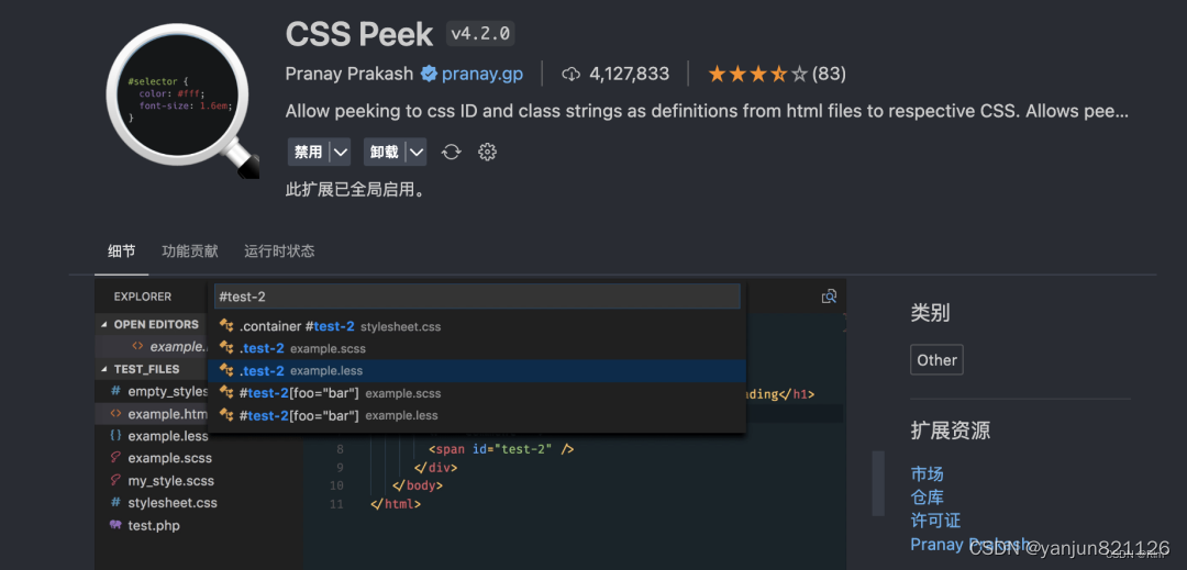 该插件帮助我们从 HTML 和 JavaScript 文件快速导航和编辑外部样式表中定义的 CSS 样式。它提供了一个“Peek”功能,在 HTML 中选择某个 class 或者 id 名称按住Ctrl键+鼠标左键可以直接定位到该名称的CSS的位置。