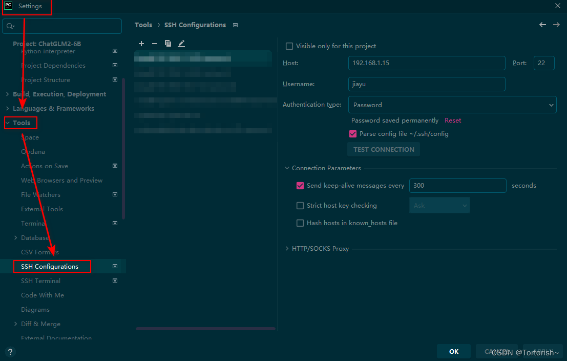 在导航栏中找到file-settings-tools-ssh configuration即可。