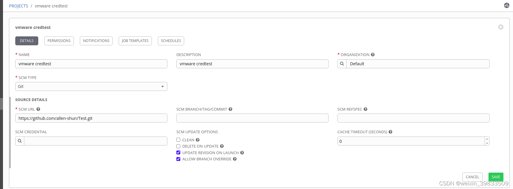 1. 上传vmware 的credential 到tower:2. 在github创建playbook yaml文件, 来获取ansible tower credential:- name: test vmwarehosts: allvars:vmware:host: '{{ lookup("env", "VMWARE_HOST") }}'username: '{{ lookup("env", "