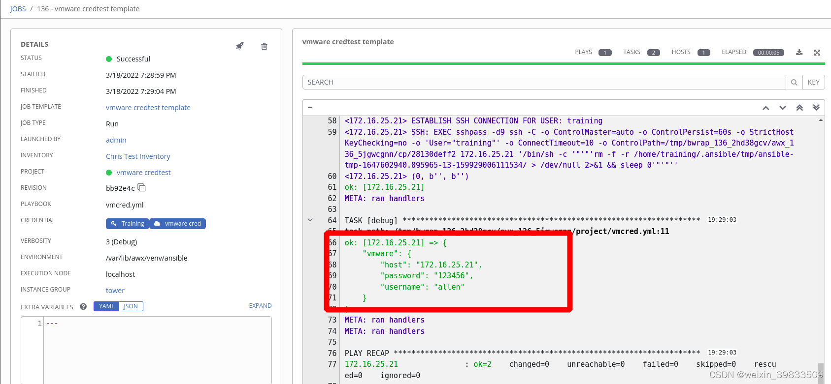 运行template, 在运行中可以验证能通过变量,获取到tower里面创建的vmware 的账号密码