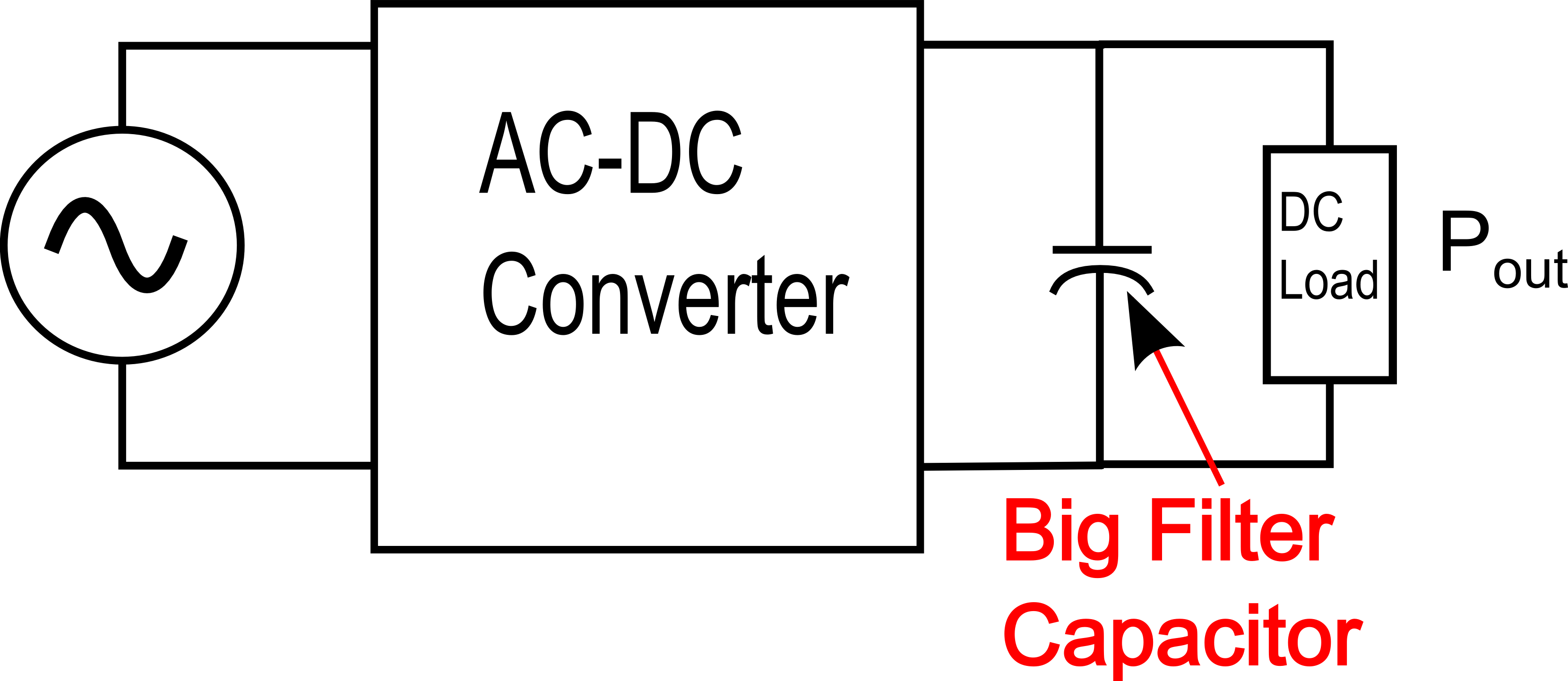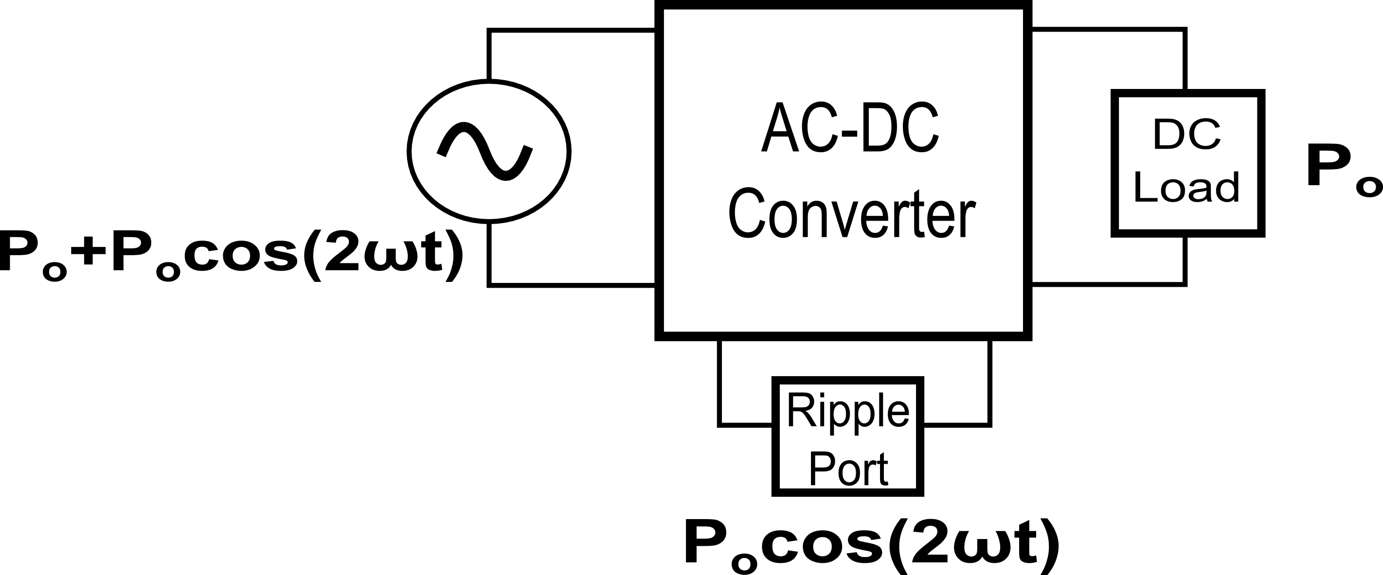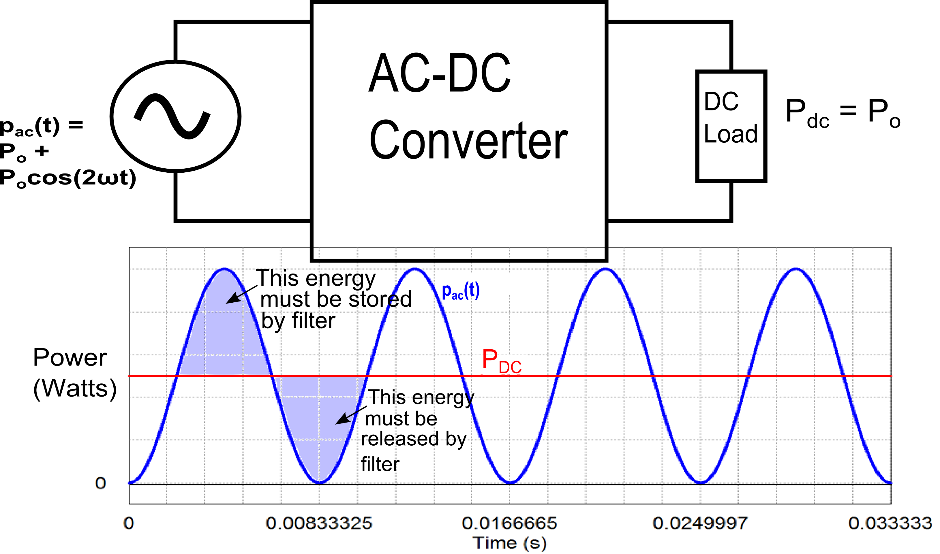 所有 AC-DC 转换器,无论是线性电源还是具有某种开关元件,都需要一种机制来获取交流侧的变化功率并在直流侧产生恒定功率。通常,大滤波电容器用于在交流功率高于直流负载所需时吸收和存储能量,并在交流功率低于所需时向负载提供能量。图 1 是表示交流线路频率为 \[\omega\] 的通用 AC-DC 转换器的功率输入和功率输出的框图。无论转换器模块内部的具体情况如何,所有转换器都将具有变化的输入功率并需要恒定的输出功率。