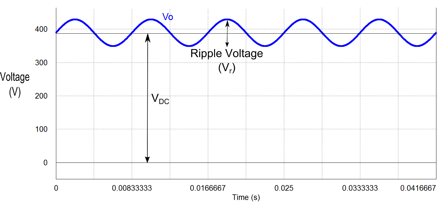 线路频率为 60 Hz、390V 时输出功率为 700W、纹波为 8V 的示例系统需要 595uF 的电容。如果您要测量该系统的输出电压,它会看起来像这样(请注意,为了说明目的,该图中的纹波被夸大了):