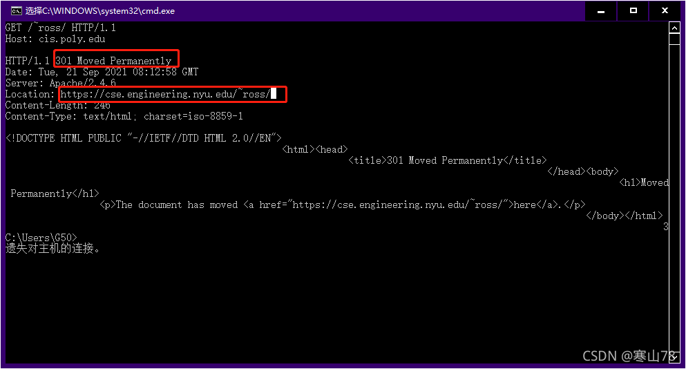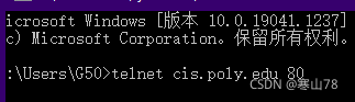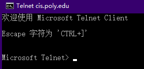 1、windows10默认关闭了telnet服务。打开方法:Telnet模拟http登陆实验 - 蜜汁尴尬 - 博客园2、打开dos命令窗口,快捷键windows+R,输入cmd;输入要连接的网址telnet cis.poly.edu 803、按Ctrl+]组合键打开回显功能(便于查看自己输入的字符):如下图4、然后再一次回车,进入编辑状态,如下图:5、 输入下面内容,并按回车:GET /~ros