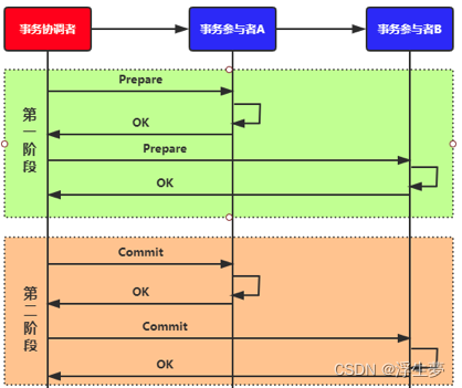 两阶段提交算法中有两种角色:事务协调者和事务参与者,一个事务一般会涉及多个事务参与者,具体的两阶段过程如下图所示:
