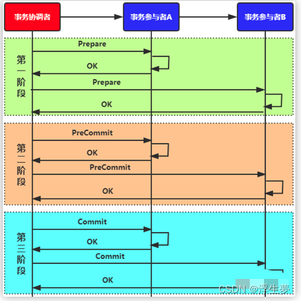 三阶段提交是将第二阶段拆分成预提交和确认提交两个阶段。这样在事务提交过程中,无论哪个节点宕机,只要有一个存活节点处于预提交或是提交状态我们都可以确定事务是可以提交的(第一阶段已经确认事务可以提交),反之如果没有处于这两种状态的节点,则回滚事务。