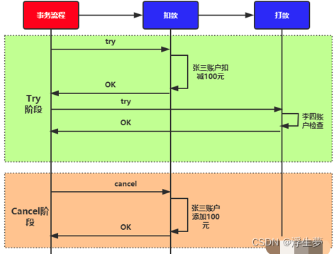 如果Try失败,张三账户增加100元,删除扣减事件记录(释放预留资源),事务取消。