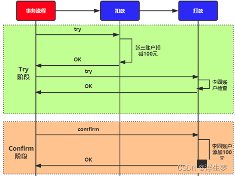 我们用一个转账汇款的业务场景,说明下TCC的具体过程。例如:张三给李四转账100元,一次转账业务由两个本地事务组成:1、张三账户扣减100元;2、李四账户增加100元。