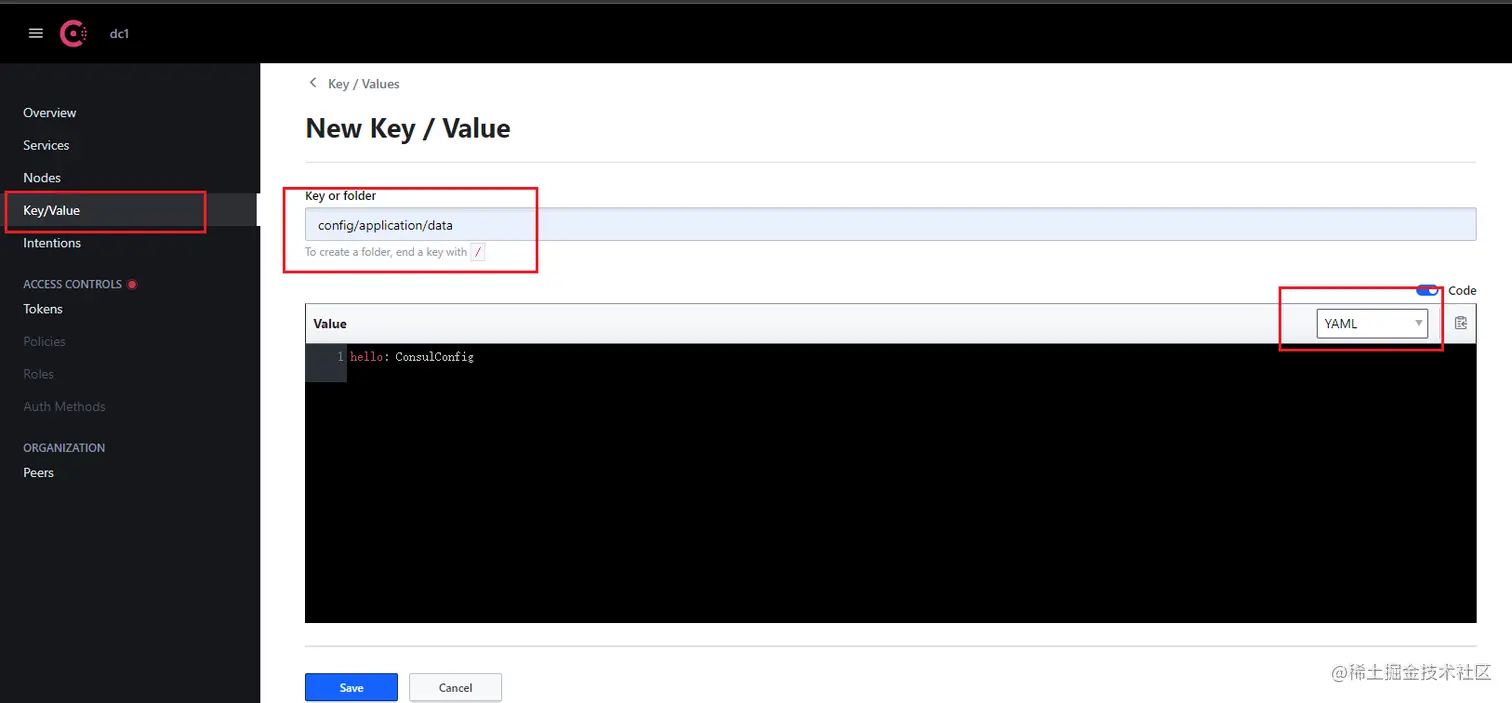 在Consul里面添加配置:key的值是:prefixes+default-context+data-key。如上配置的话最终是:config/application/data
