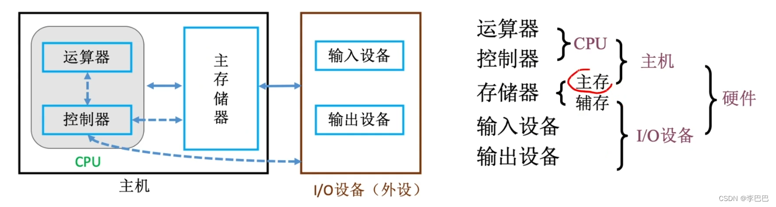 一般将运算器和控制器集成到同一个芯片上,称为中央处理器(CPU)。CPU和主存储器共同构成主机,而除主机外的其他硬件装置(外存、I/O设备等)统称为外部设备,简称外设。