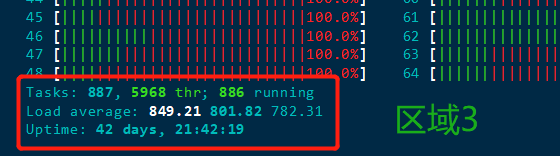 第三区域:任务、线程、平均负载及系统运行时间的信息。平均负载部分提供了三个数字,这仅仅表示的是过去的5分钟、10分钟和15分钟系统的平均负载而已,在单核的系统中平均负载为1表示的是百分之百的 CPU 利用率。最后,运行时间 (uptime)标示的数字是从系统启动起到当前的运行总时间