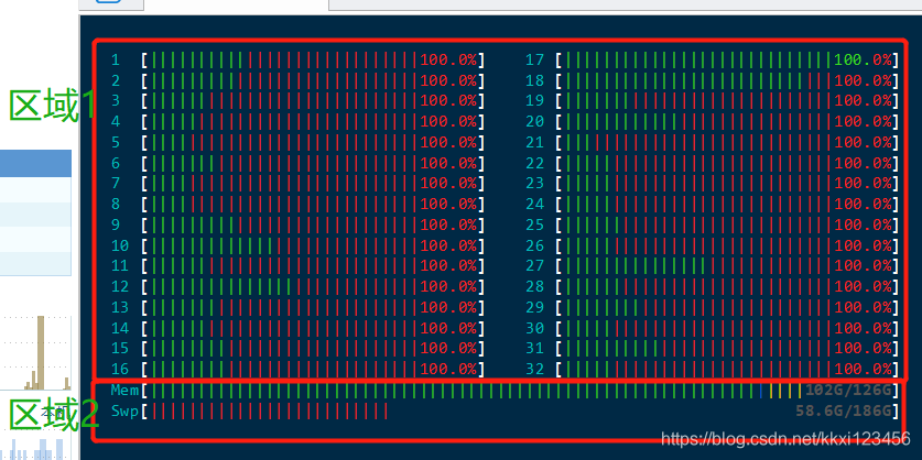 第一区域:显示CPU当前的运行负载。红色表示实时负载,100%代表cpu使用率。