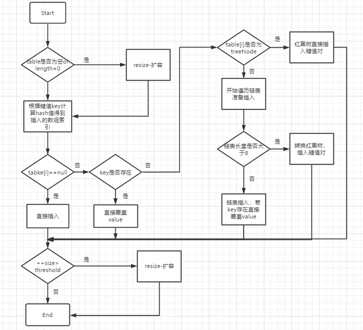 - 如果索引处存在元素,则遍历插入,有两种情况,一种是链表形式就直接遍历到尾端插入,一种是红黑树就按照红黑树结构插入