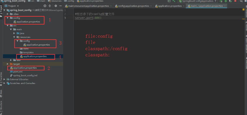 - 本地配置文件:如 application.properties 或 application.yml。位于类路径根目录下,默认情况下会被 Nacos、apollo等配置中心自动加载并覆盖。