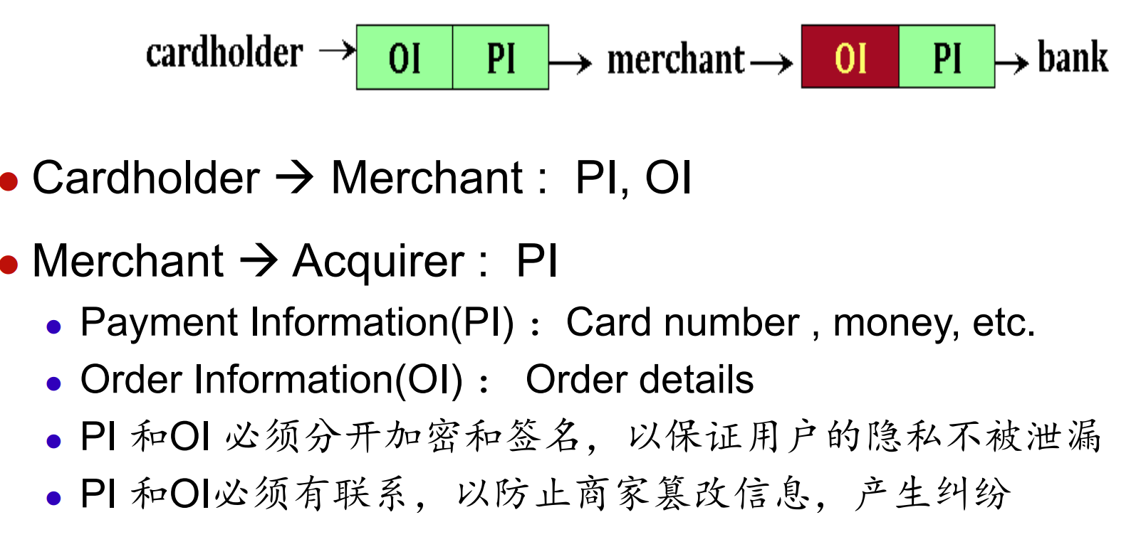 参与方:发卡行,持卡人,网上商家,支付网关,收款行,证书授权。