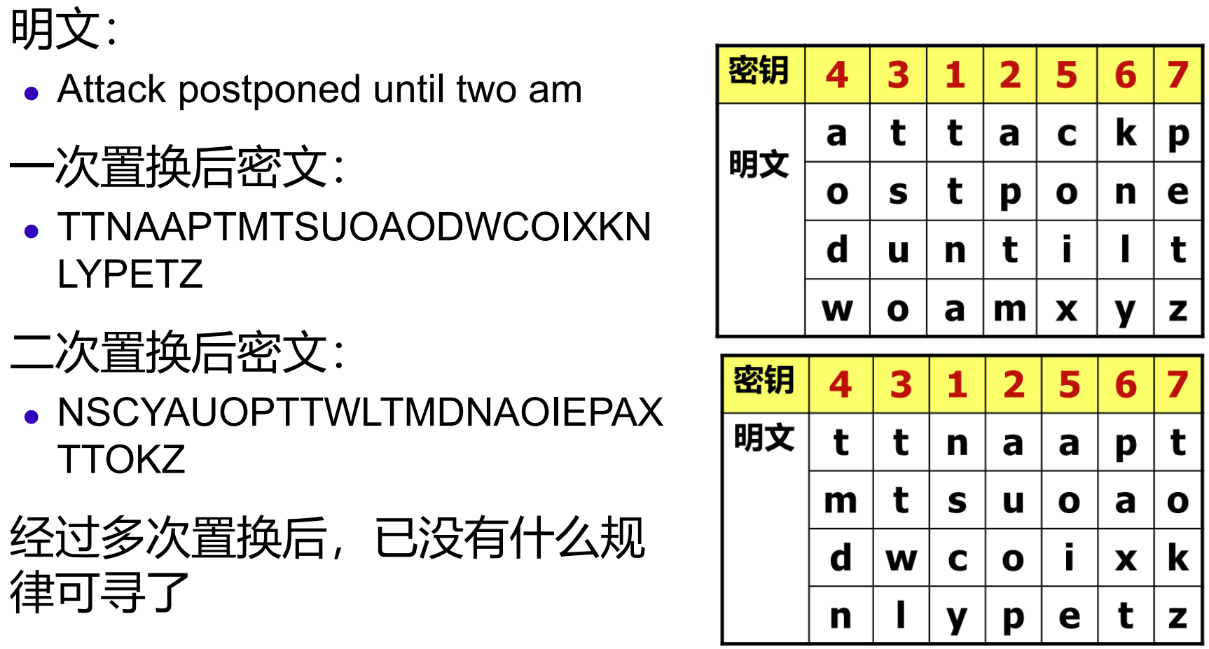置换技术:通过置换形成新的排列,比如消息按行写入矩形块,再按列读出,同时把列的顺序打乱;此时列的顺序就是密钥。