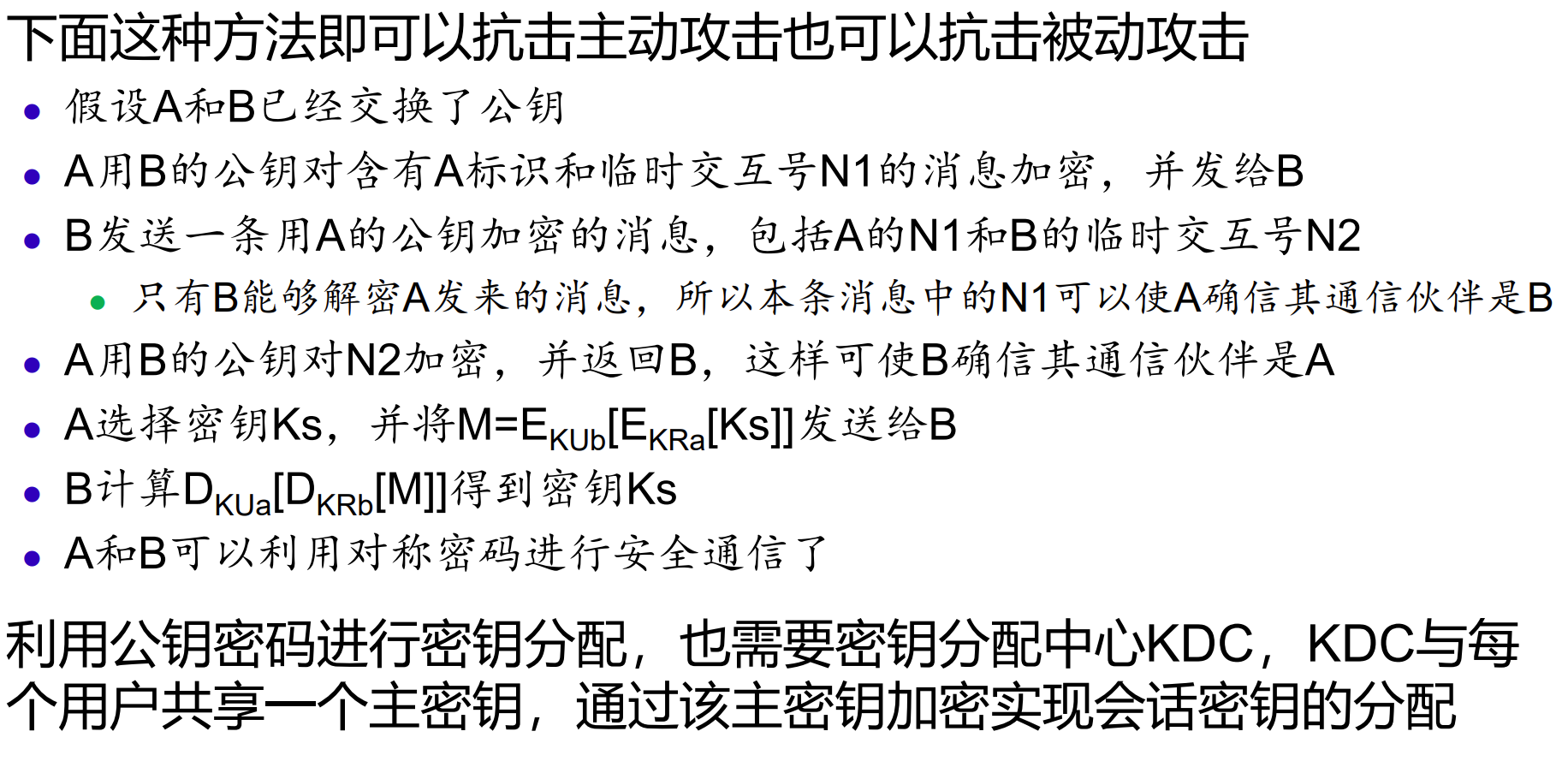 把hash用于认证的方法很多,比如 消息|hash 拼起来然后用对称密码加密,只对hash加密(相当于mac),用公钥密码和私钥对hash加密(可以签名),用私钥加密hash,拼起来再用对称密码加密(又认证又签名又保密);每个用户与密钥分配中心KDC共享唯一的一个主密钥,A有一个除了自己只有KDC知道的主密钥Ka,B有一个除了自己只有KDC知道的主密钥Kb.分配时,A先向KDC请求一个密钥,KDC
