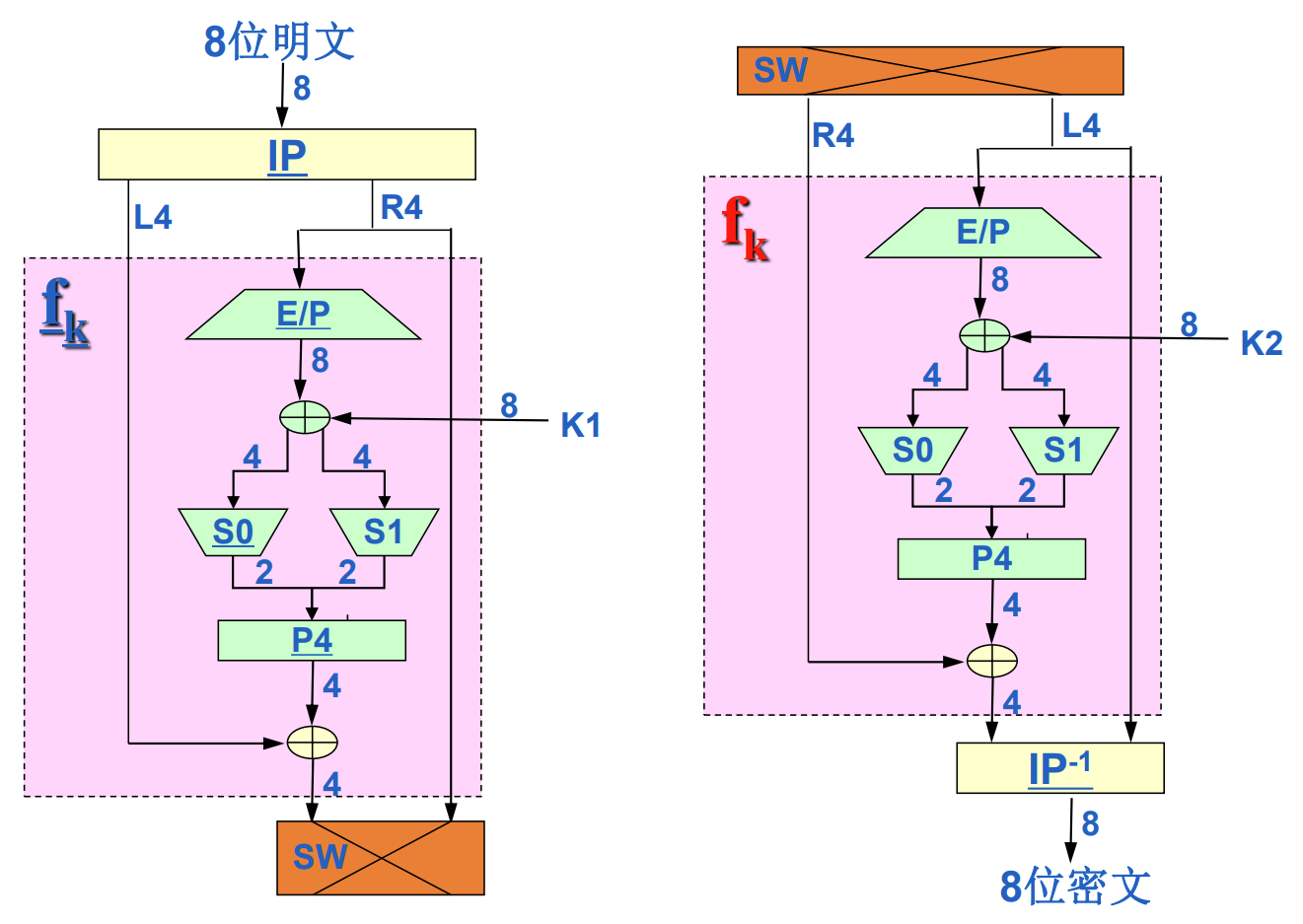 Feistel密码结构:输入是长度为2w位的明文组和密钥K;将明文组分成两个部分L0,R0,经过n轮迭代后组合成密文组。第i轮迭代的输入来自于上一轮迭代的输出;子密钥Ki由整个密钥推导得出,互不相同。每轮迭代的结构相似。