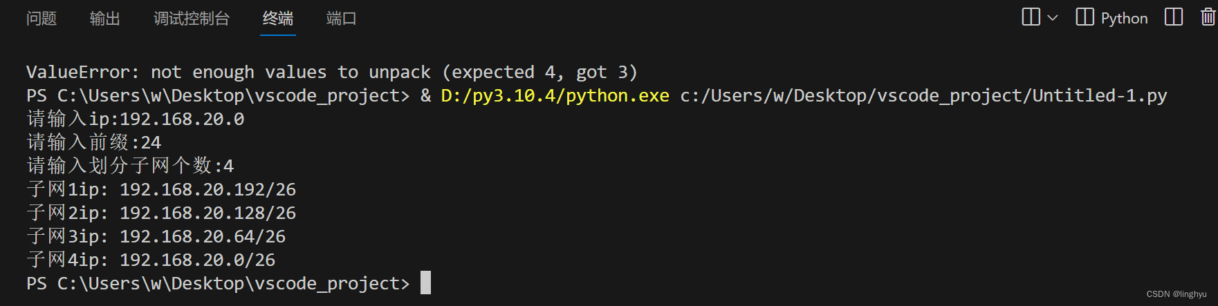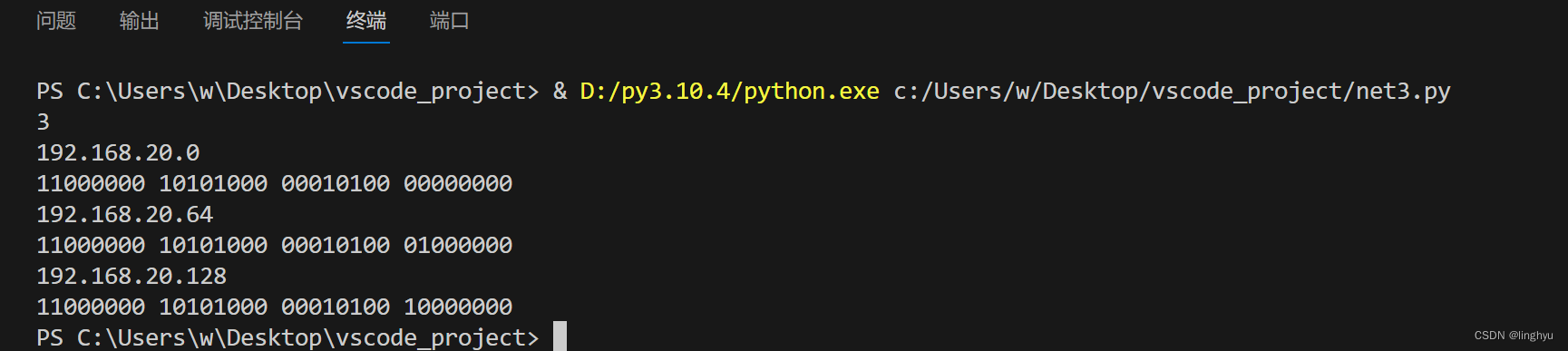 根据上述内容,确定192.168.20.129/26的子网地址,子网掩码为255.255.255.192,代码实现求子网地址:
