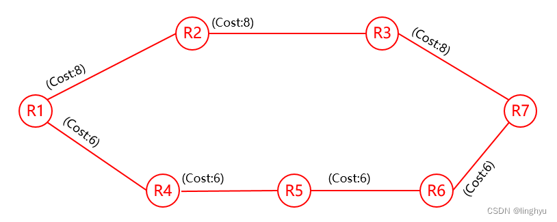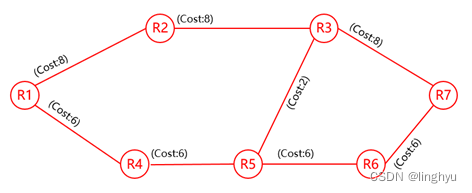 分布式(每个结点只当DV变化时才通告给邻居),异步迭代(局部链路费用改变或邻居DV更新引发迭代。距离向量(Distance Vector) 路由算法验证,构造如图所示拓扑。计算R1-R7路径,应该为R1-R2-R3-R7。源代码参考Bellman-Ford算法。