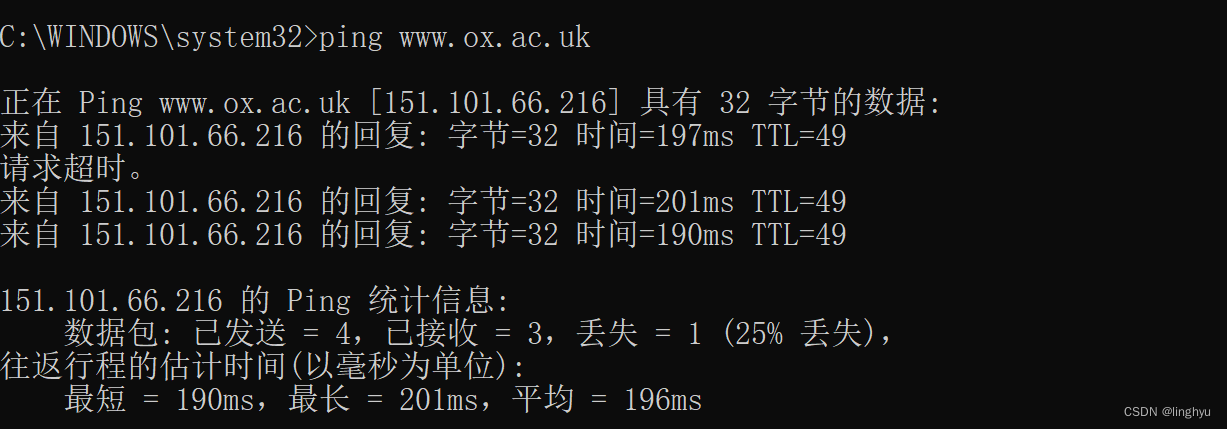 在windows系统ping www.ox.ac.uk,可以看出发生了四次32字节的Echo。使用Ping 探测该域名,Windows系统中默认发送4个32bytes的ECHO。Ping不能完全确保目标主机是否可访问,有些服务器为了防止通过Ping探测到,通过防火墙设置了禁止Ping或者在内核参数中禁止Ping。