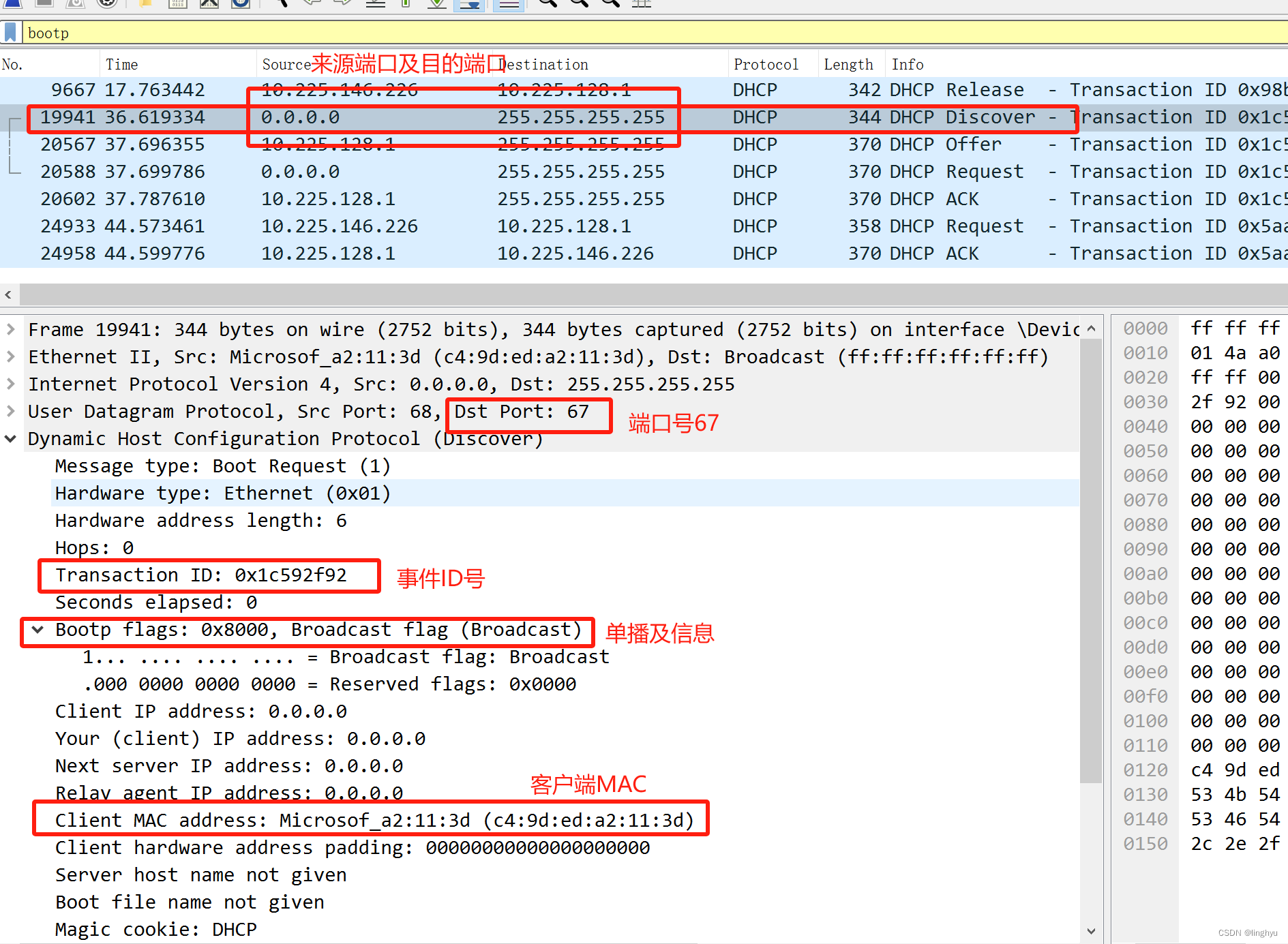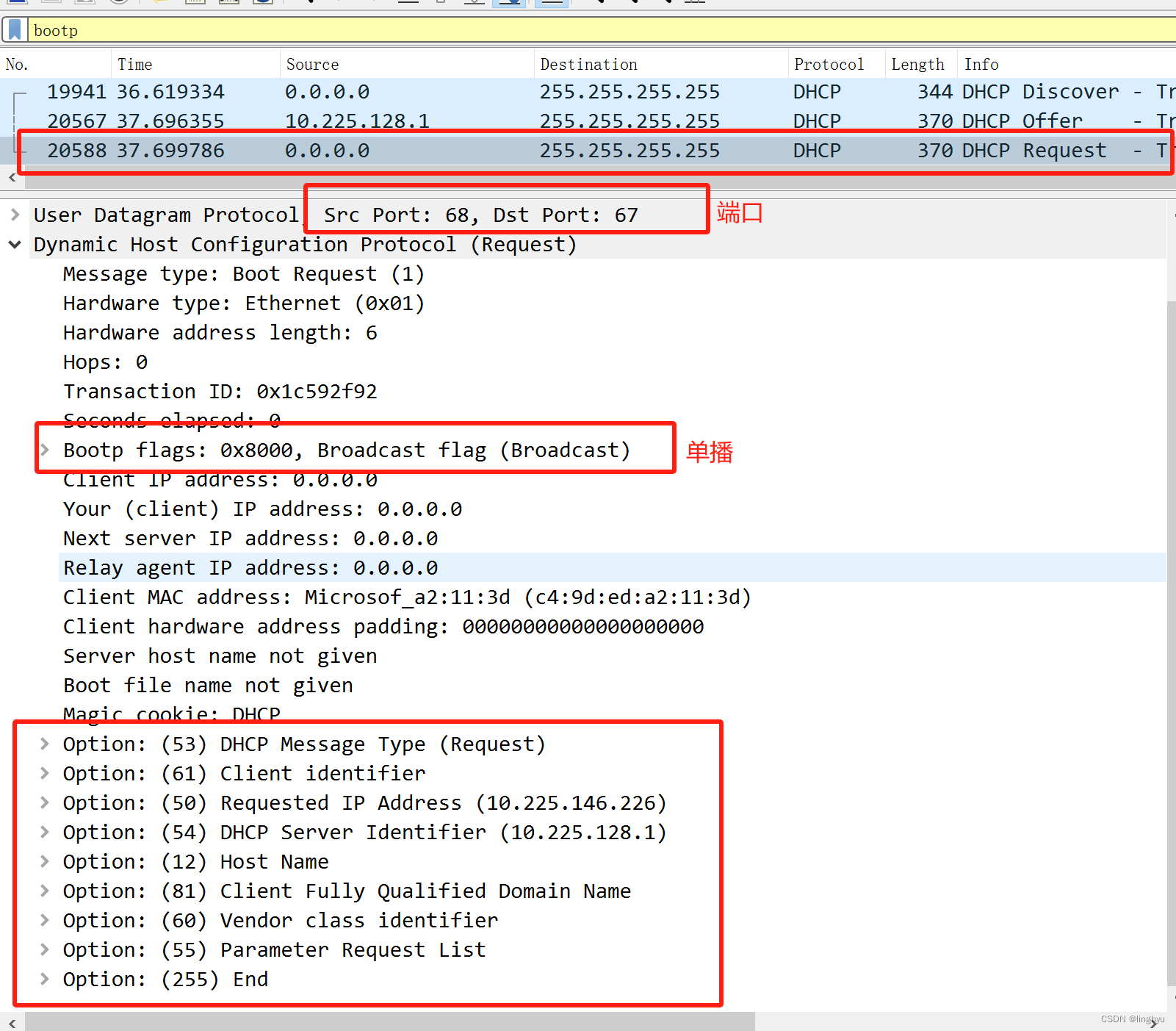 Client端使用IP地址0.0.0.0发送了一个广播包发送到目的IP为255.255.255.255。事件ID号为0x04ac90a4,发送单播,DHCP属于应用层协议,它在传输层使用UDP协议,目的端口是67。