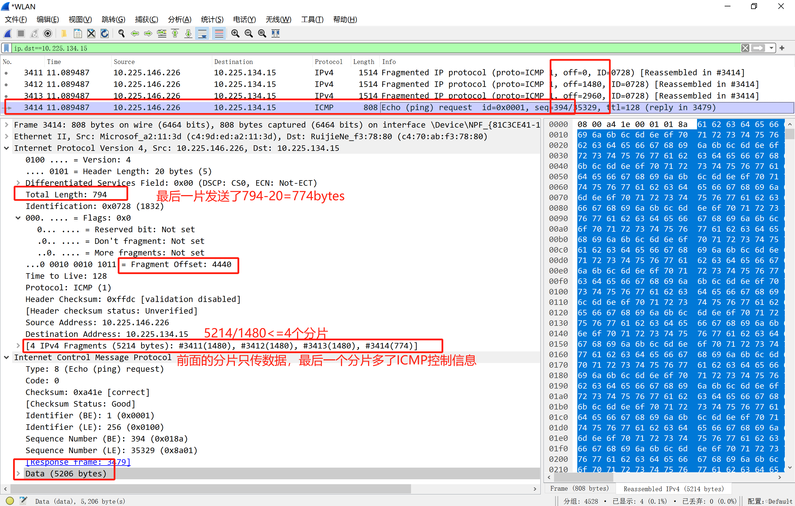 可以看到Echo被分为了4个分片,IP数据报格式和分片如上图所示。