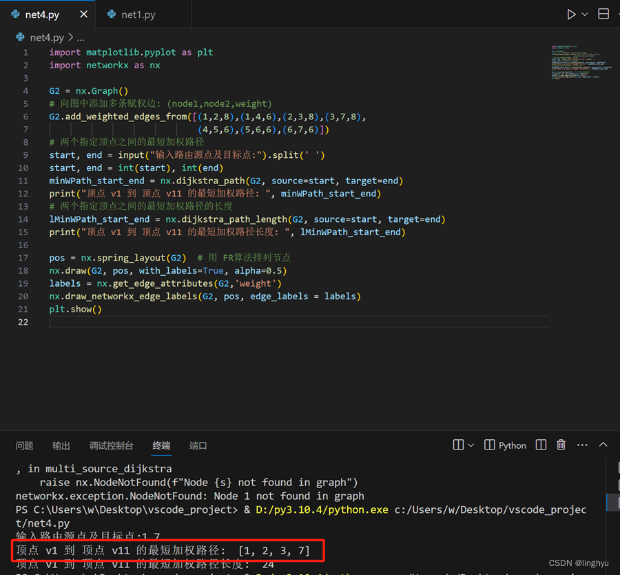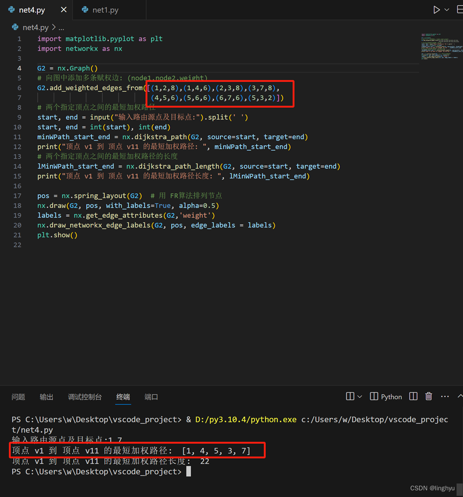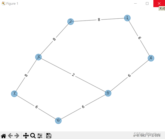 这里我调用了matplotlib,通过输入多条赋权边实现拓扑图的复现,;通过调用networkx进行Dijkstra无向图的绘制,使用库函数dijkstra_path()、dijkstra_path_length()、spring_layout()等实现求取最短加权路径及长度。