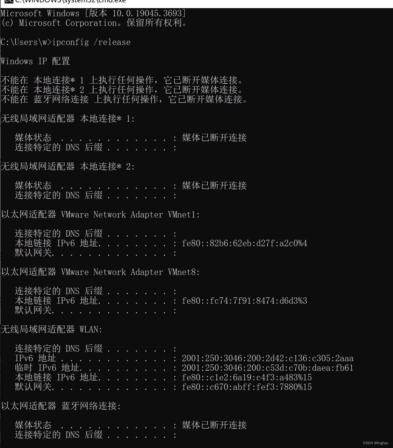 ipconfig /release :断开当前的网络连接,主机IP变为0.0.0.0,主机与网络断开,不能访问网络。