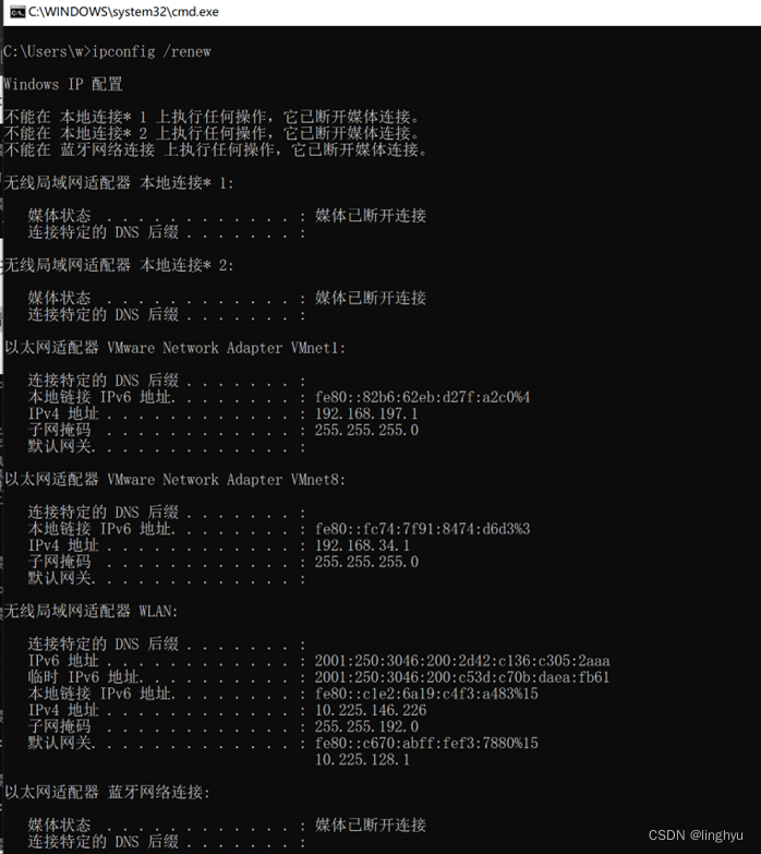 ipconfig /renew :更新适配器信息,请求连接网络,这条命令结束之后,主机会获得一个可用的IP,再次接入网络。