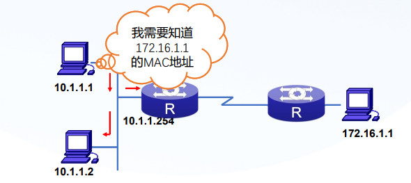 • 主机10.1.1.1需要给不在同一网段的主机172.16.1.1发送数据,但是不知道它的MAC地址,因此发送ARP广播
